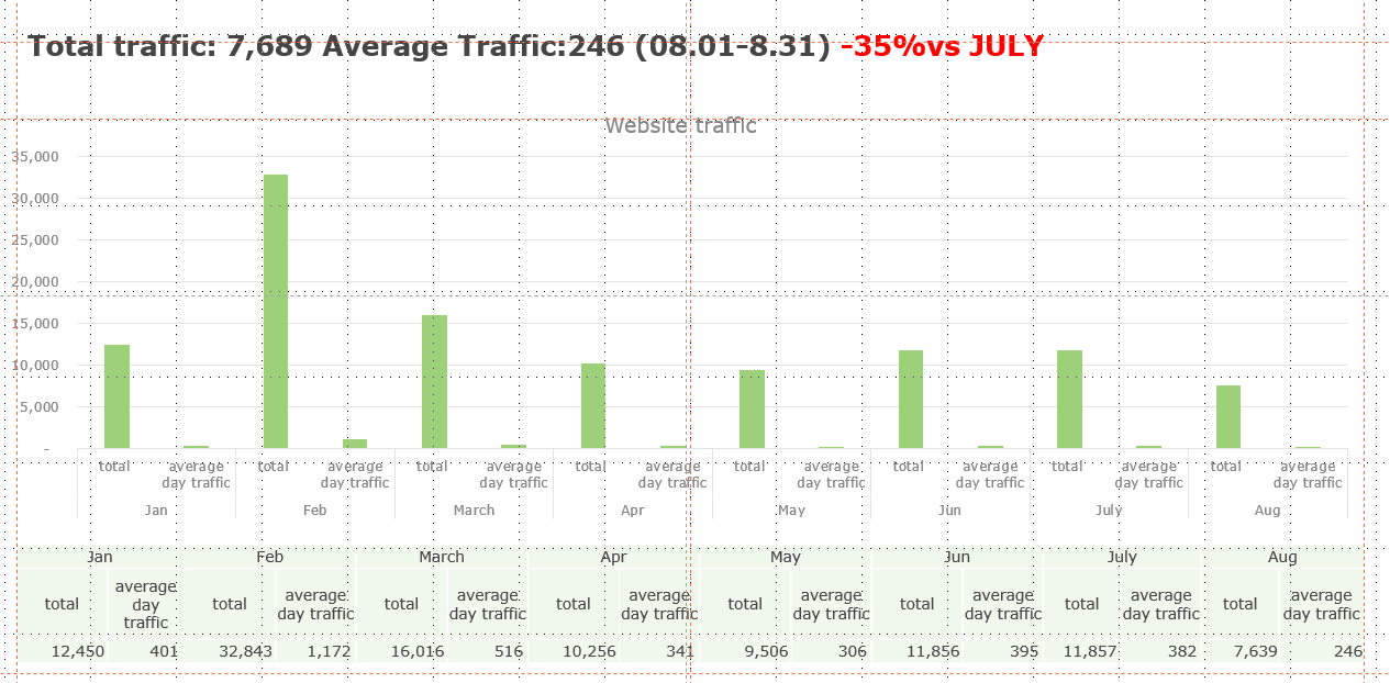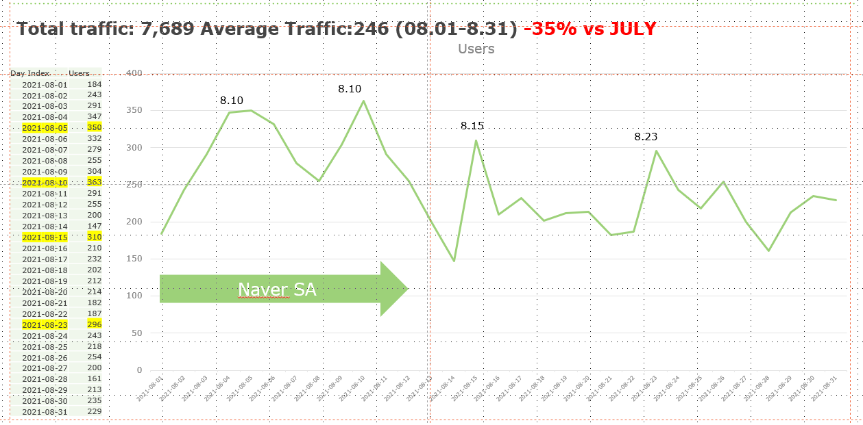 the total traffic was 7,689 users and the average traffice was 245 users. but, compared to july, there was a big decrease by 35 percent due to shortage in adversting budget.